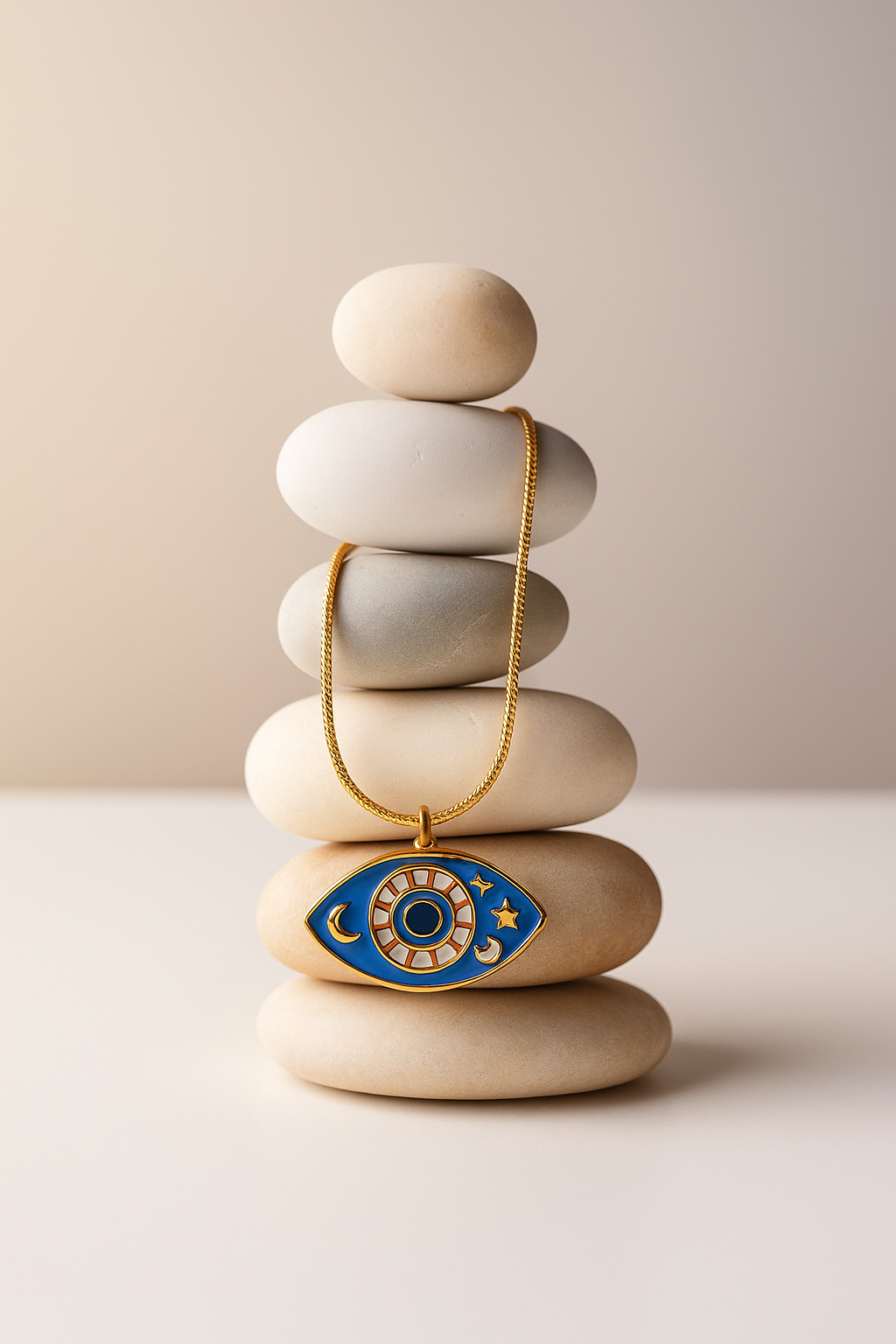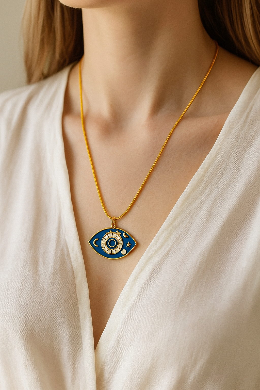 The Celeste Charm Pendant from our Evil Eye Collection embodies intuition, serenity, and the quiet power of a clear mind. This striking, classic eye-shaped amulet captures a moment of tranquil twilight. Set in calming shades of cerulean blue and pristine white enamel, the iris of the eye resembles a spinning wheel of cosmic energy. Adorned with delicate moon, star, and cloud detailing, the Celeste Charm doesn't just block negativity; it soothes your spirit and guides your subconscious.