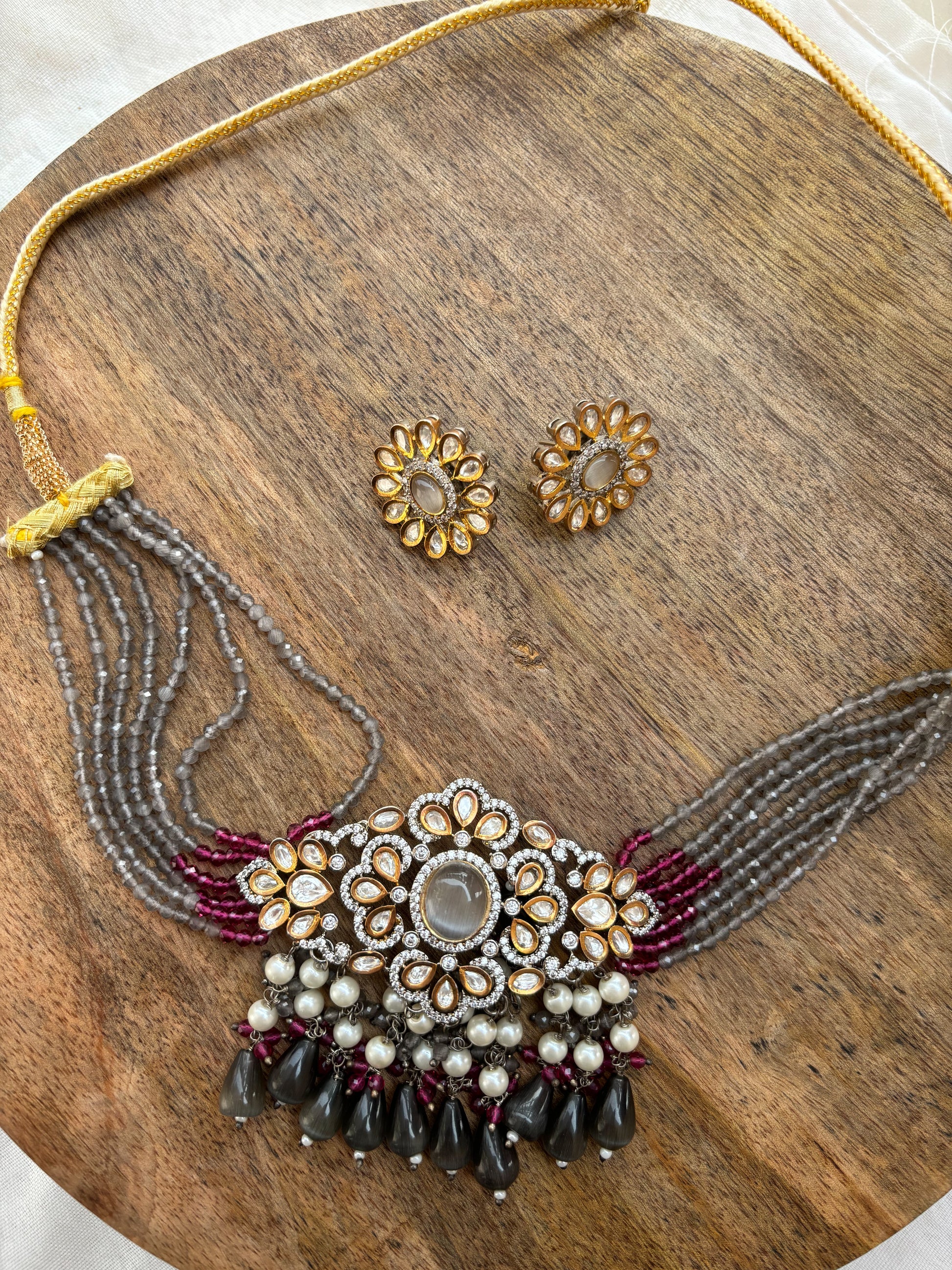 This captivating choker boasts a mesmerizing combination of Kundan and stones, intricately arranged to evoke the beauty of twilight in a vineyard. The grey tones symbolize the soft whispers of dusk, while the deep wine hues exude the richness of ripe grapes.