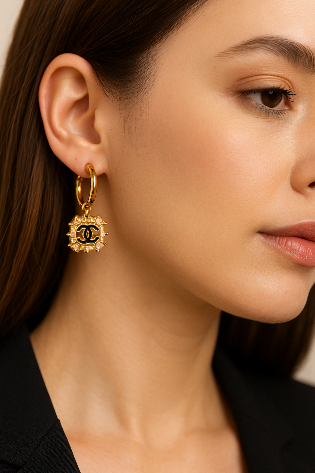 Elegant Gold Earrings with Black Logo – Designer Inspired Statement Jewelry