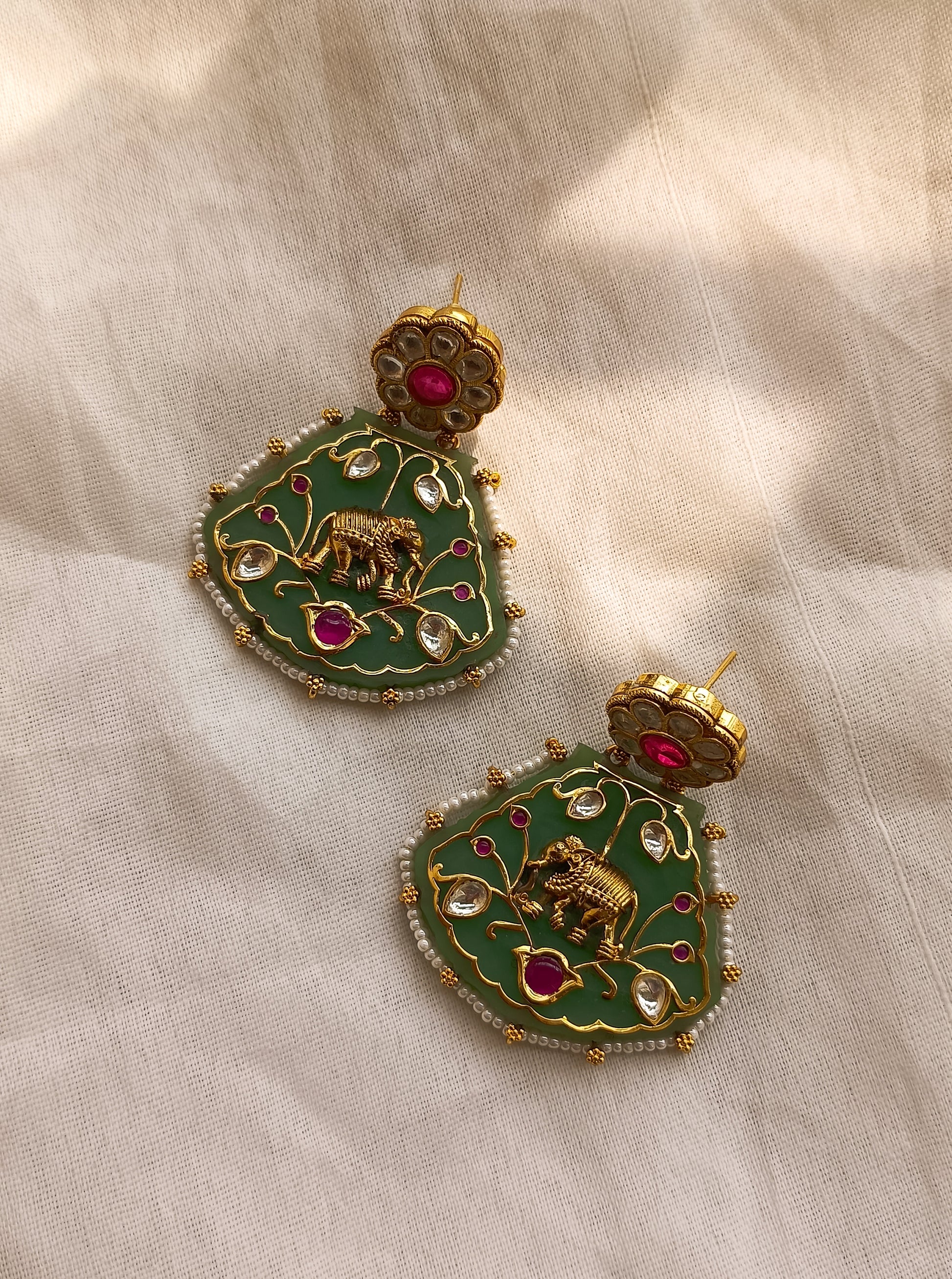 Embrace a touch of traditional charm with our green kundan earrings featuring a striking red stone, and adorned with an intricate elephant design in centre.