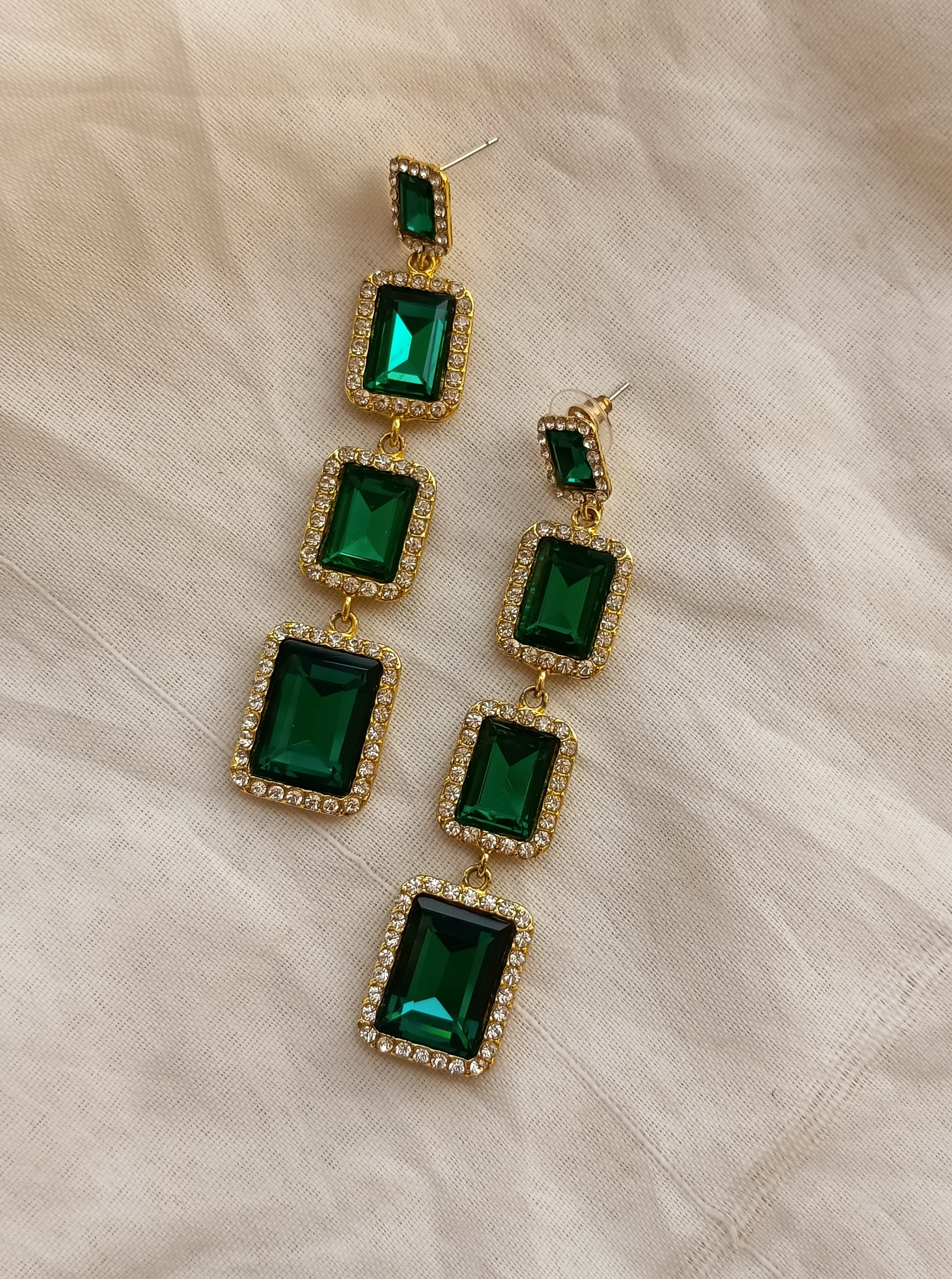 Add a glamourous touch with Green Rhinestone Square Drop earrings. These feature varying sizes of square rhinestones, beautifully accented by golden plating.