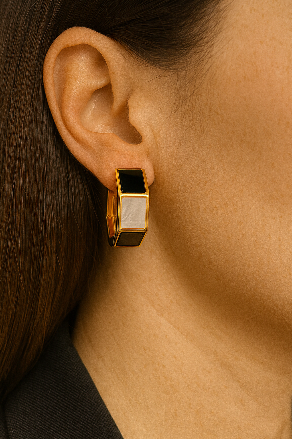 Make a bold style statement with these gold and black hexagon earrings, designed to fuse modern geometry with timeless elegance. Each earring features a glossy black center encased in a luxurious gold border, forming a sleek hexagonal silhouette that adds a contemporary edge to any look.