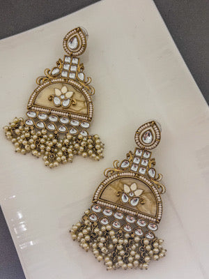 Step into timeless elegance with these Gold Kundan Dome Earrings featuring intricate mirror work and cascading pearl clusters.