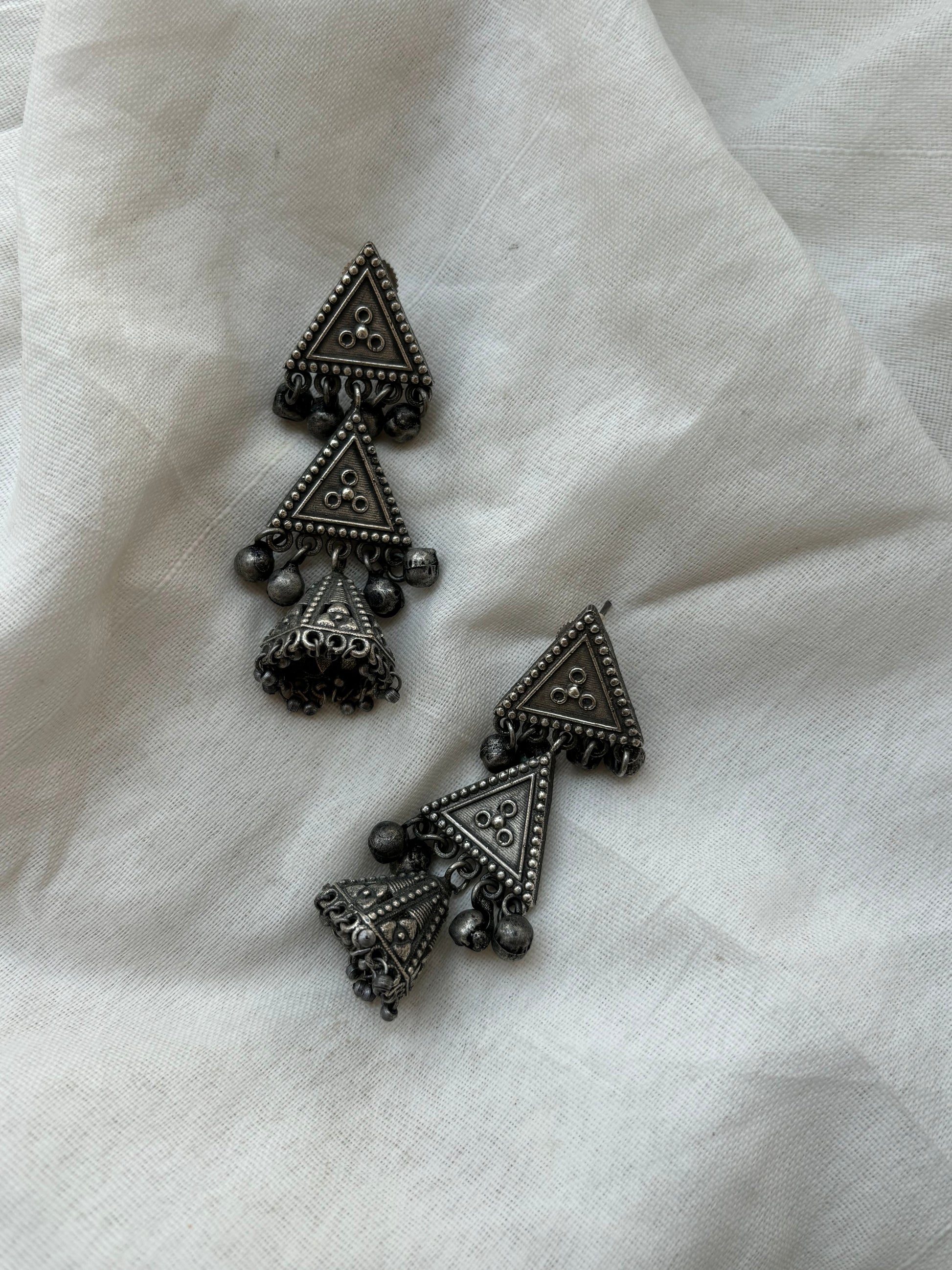 Revel in the intricacy of Indian craftsmanship with our Kanijuwa Oxidized Earrings. These lightweight jhumki earrings boast brass construction and intricate detailing, exuding timeless charm and elegance.