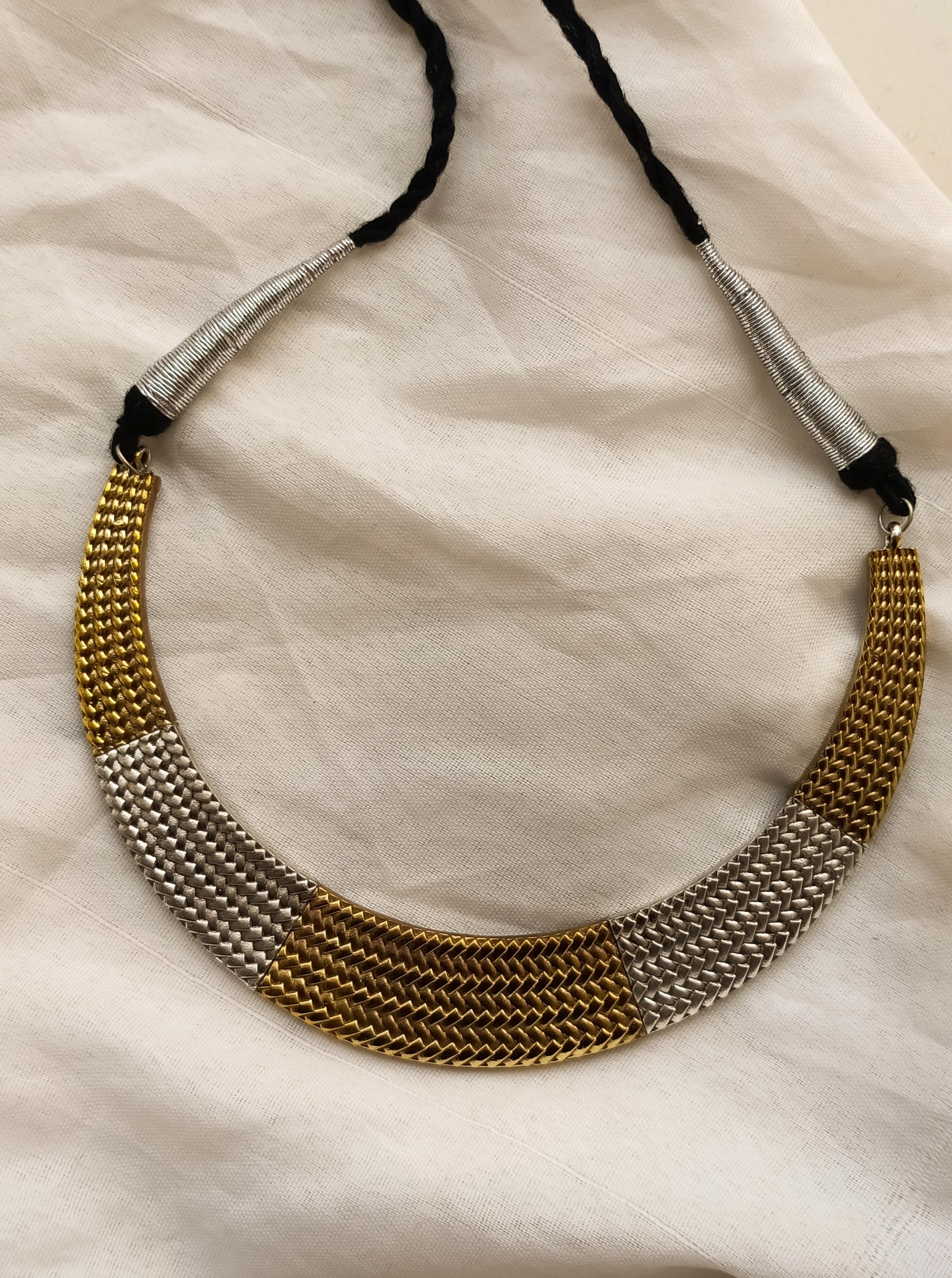 Embrace rustic elegance with our Oxidized Necklace featuring four strands of interconnected silver and gold-toned beads.