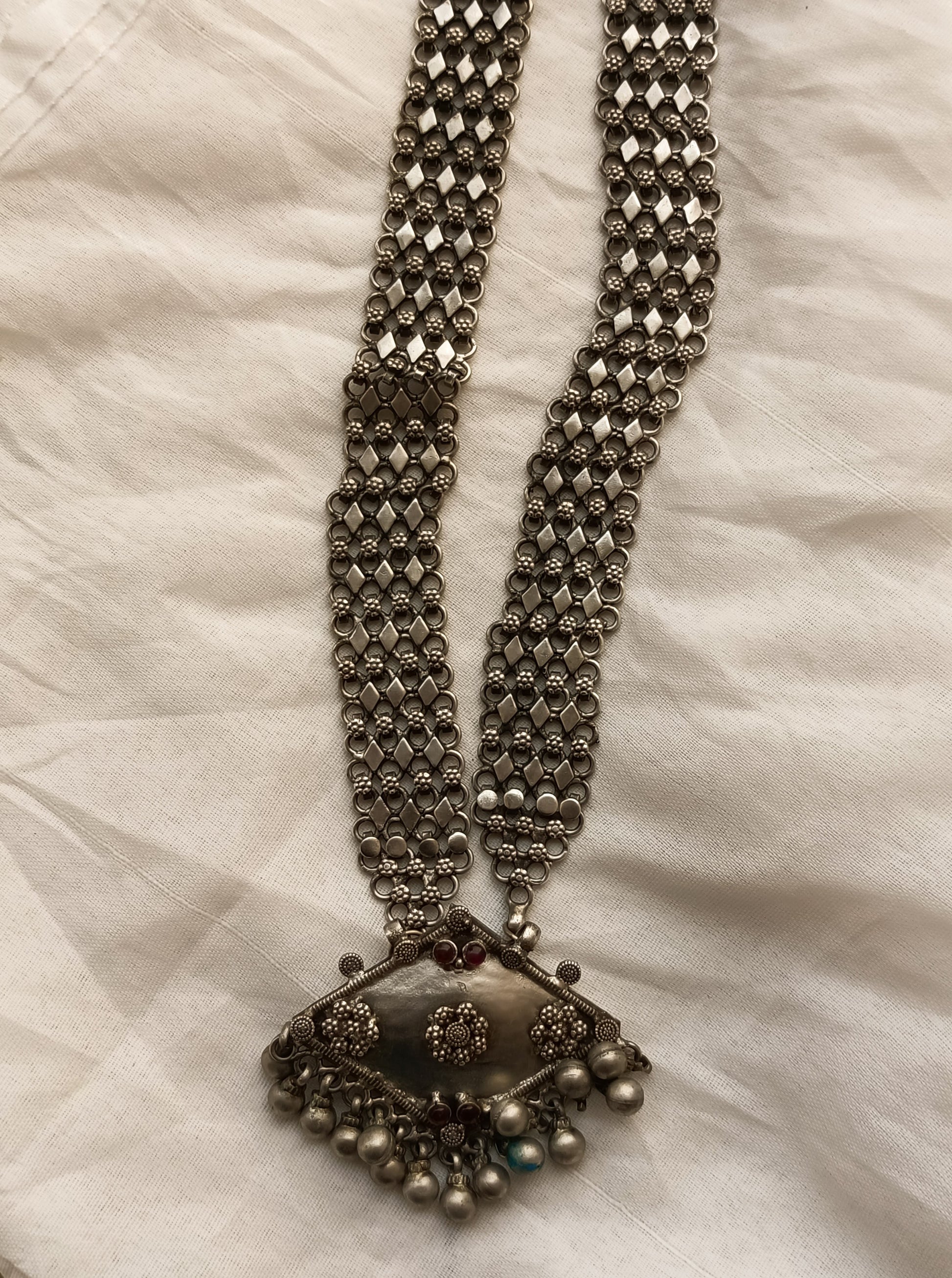 Make a statement with our Oxidized Necklace featuring a bold diamond-shaped pendant adorned with playful ghungroos at the bottom, exuding rustic charm and vibrancy.