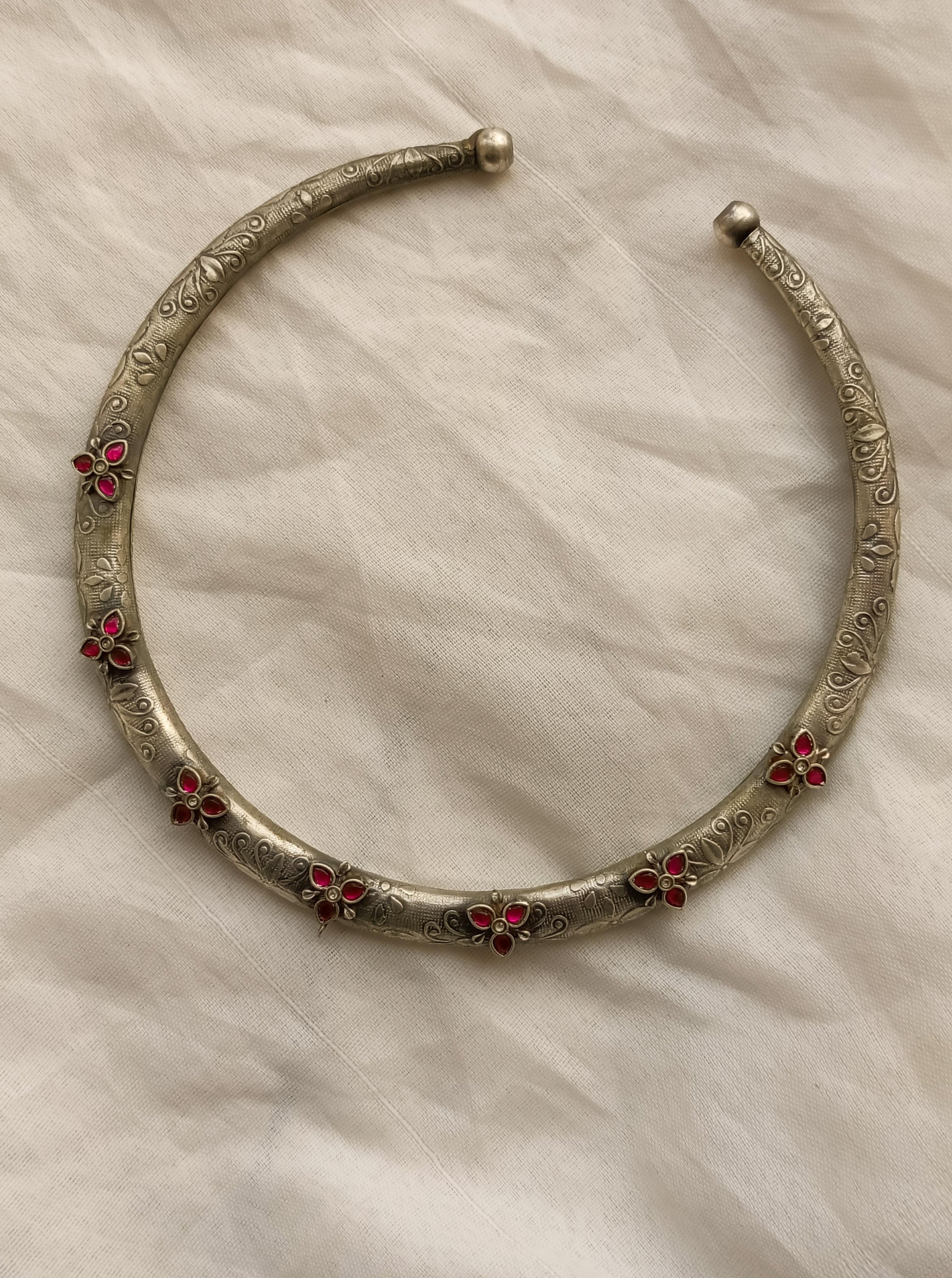 Elevate your ethnic style with our Oxidized Bangle Choker Necklace, adorned with exquisite red stones for a touch of tradition and elegance.