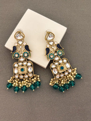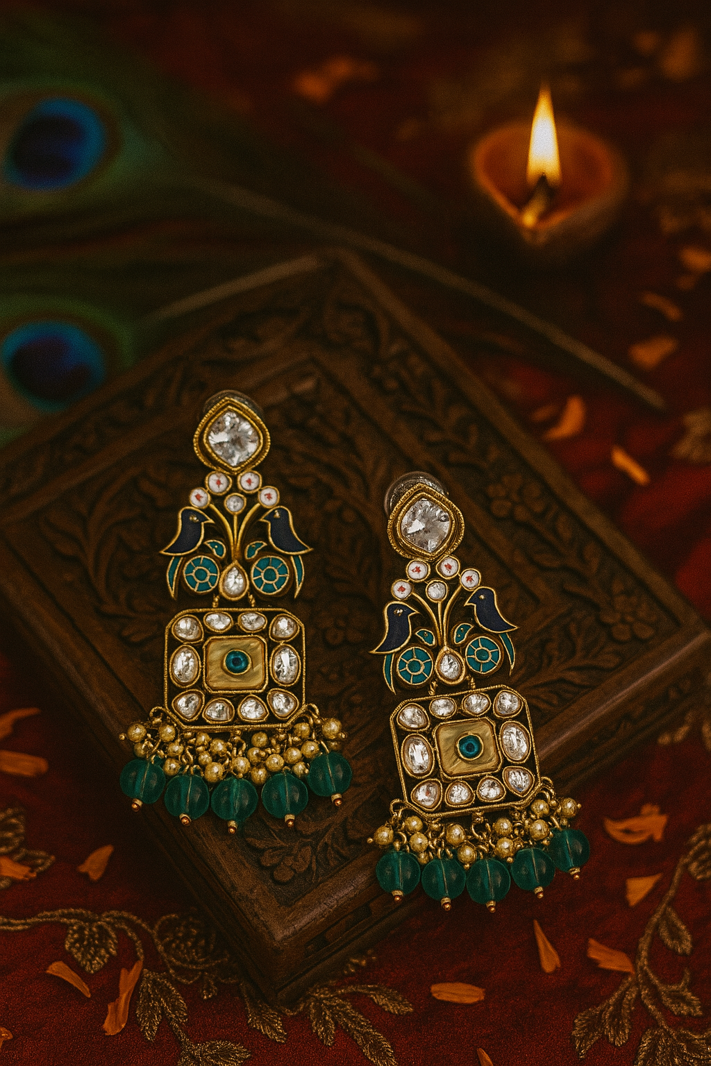 Peacock Meenakari Kundan Jhumka Earrings with Green Beads