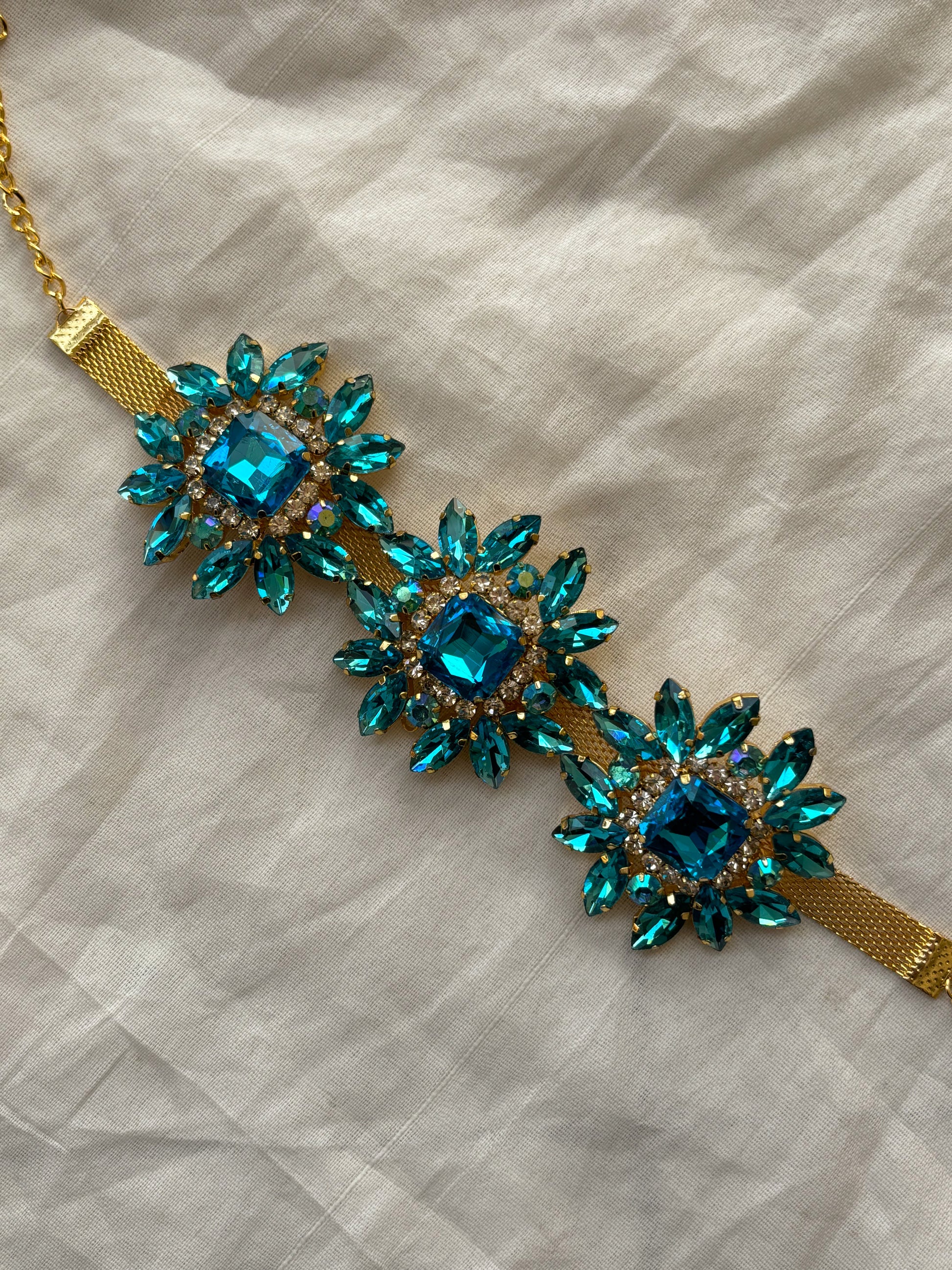Make a statement with our Rhinestone Necklace, featuring a luxurious golden choker adorned with exquisite blue floral designs.