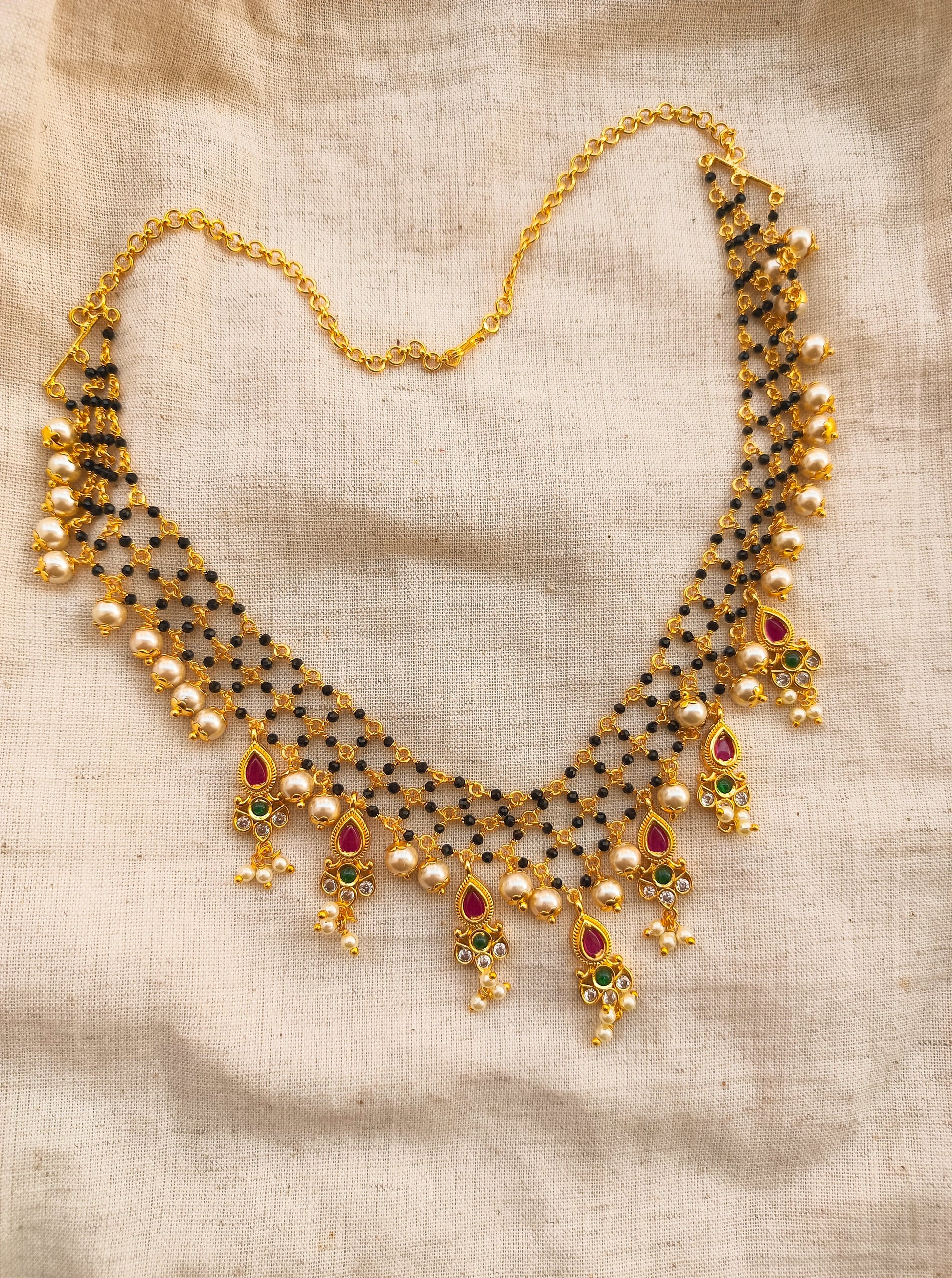 Discover our exquisite decorative necklace featuring intricate gold and red accents.