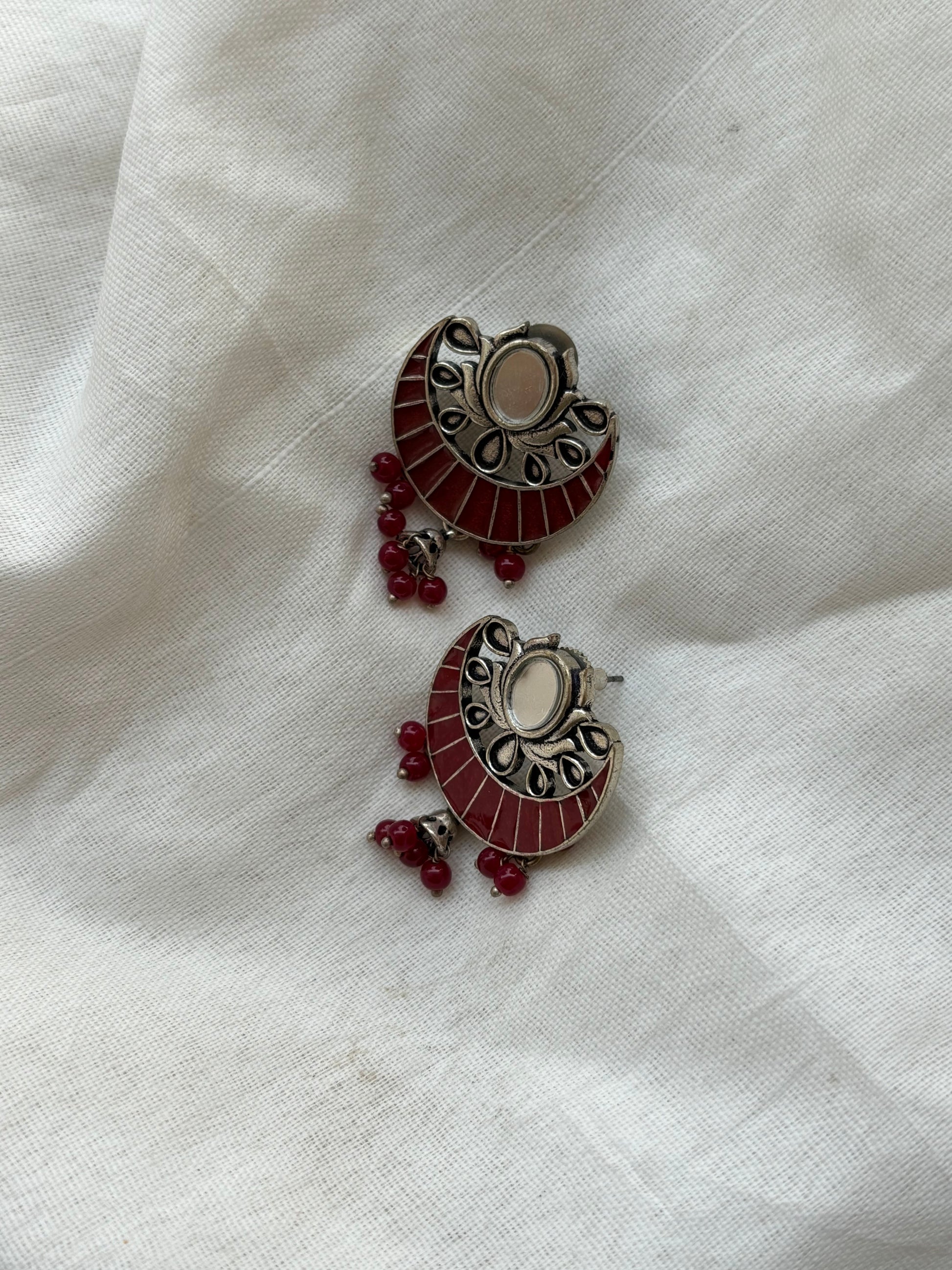 Adorn yourself with the enchanting beauty of the night sky with our Shukr Oxidized Earrings . Featuring a moon-shaped design with red enamel detailing, these earrings evoke the celestial splendor of a moonlit night.