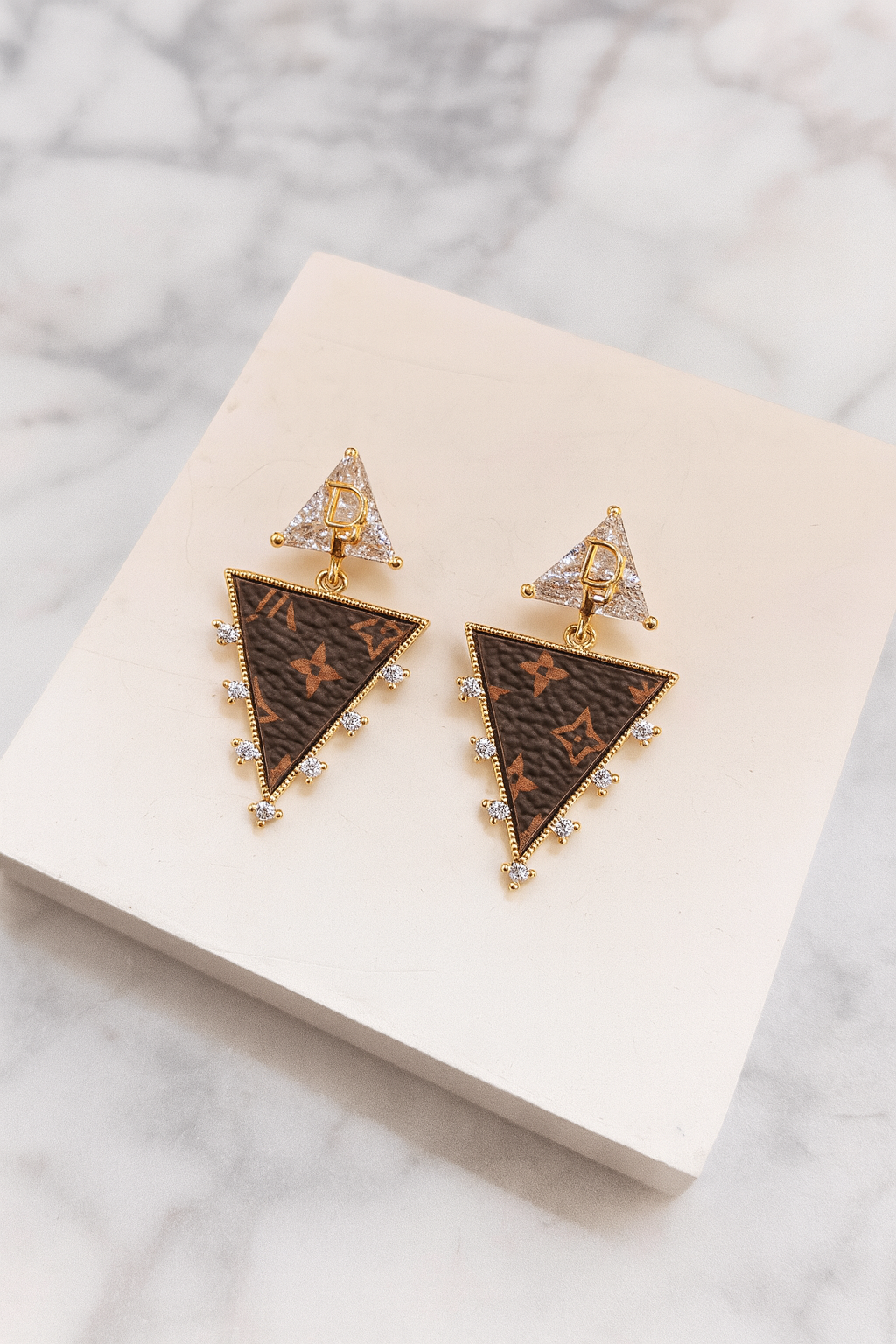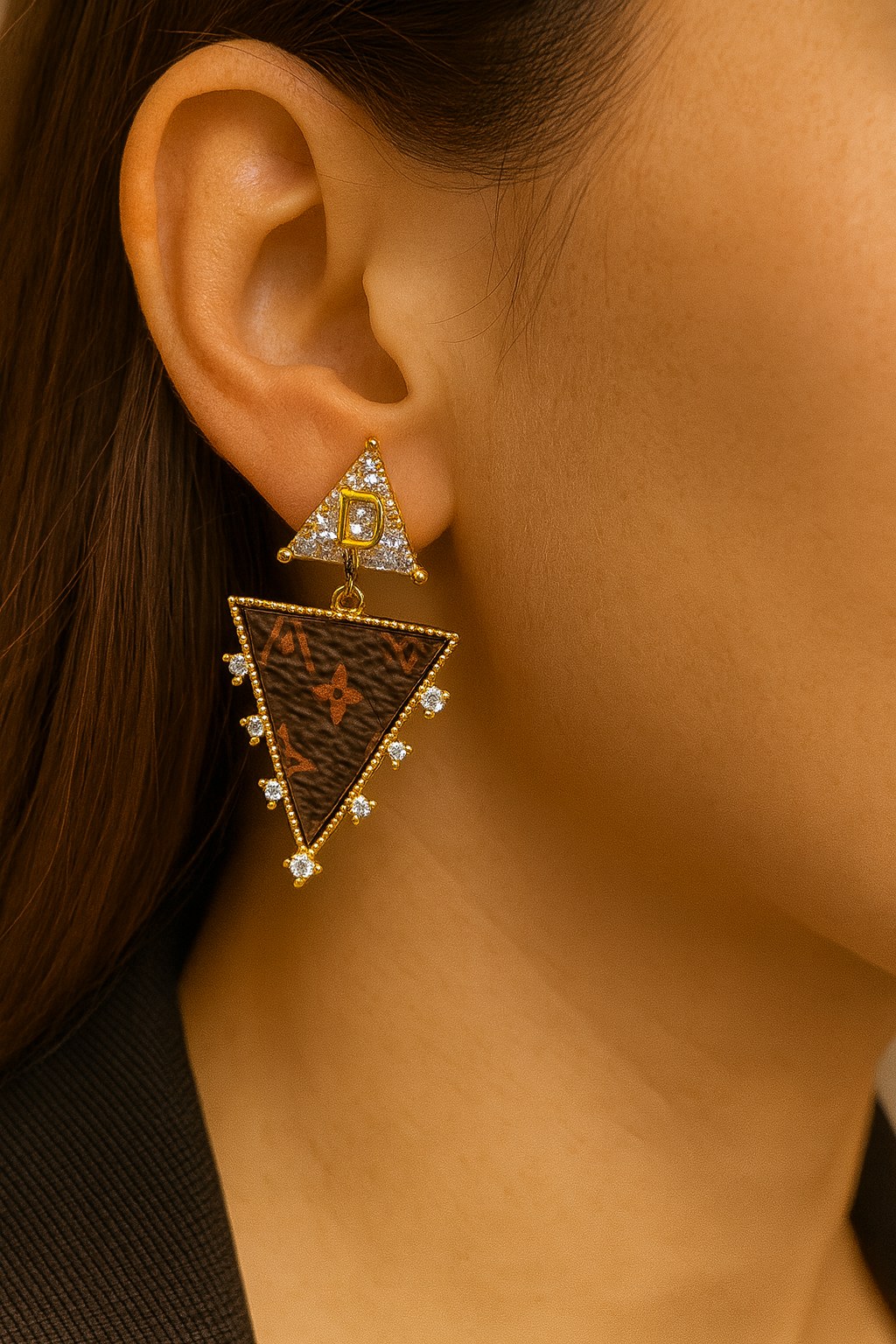 Add a refined touch to your jewelry collection with these triangular brown and gold earrings, designed to blend geometric sophistication with luxurious charm.